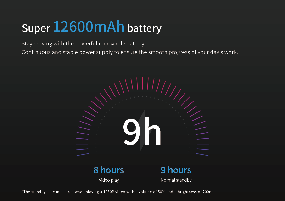8hrs (default 50% volumn,default 200 lumens brightness,play 1080P HD video) |