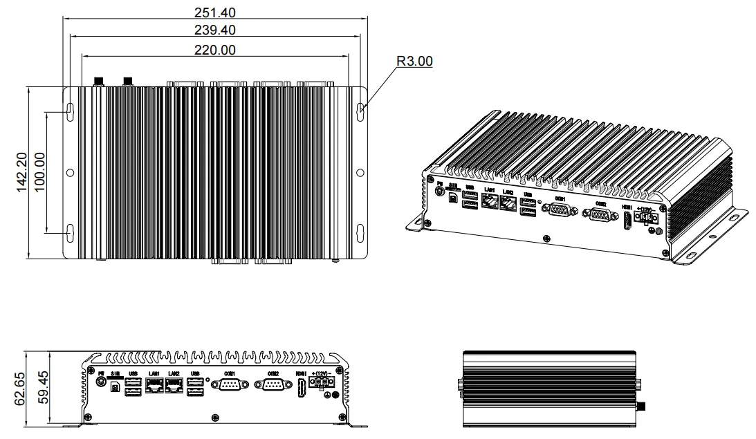 1*2PIN Phoenix terminal, supports 12V voltage input, optional 9-36V wide voltage input 1*button switch with light 1*HDMI 4*USB3.0 2*LAN 1*SIM card slot 2*COM (COM1/COM2 optional RS232/RS485) |