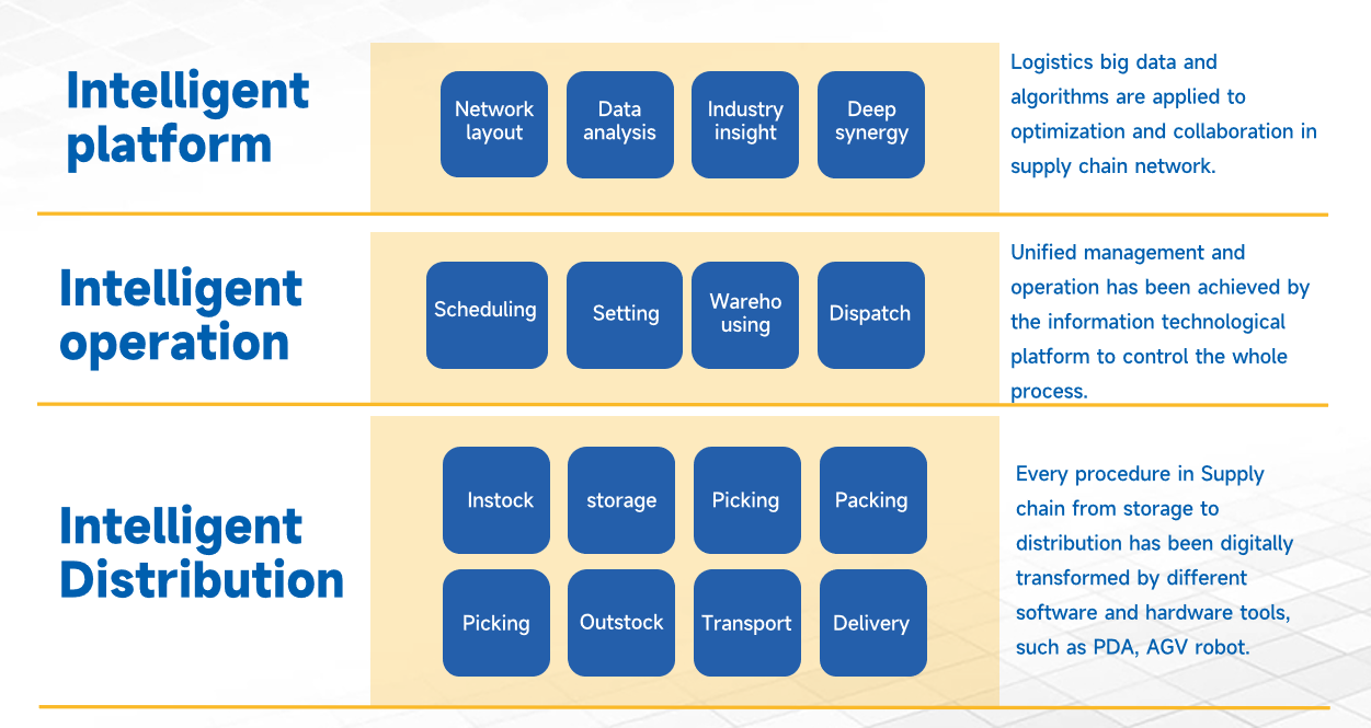 Intelligent warehousing and logistics is to realize dynamic and visual management of every processing link in warehousing and logistics, to improve the intelligent analysis ability, decision-making and automatic operation ability, and optimize the operation efficiency through intelligent technical means such as intelligent hardware and software, Internet of Things, big data technology and so on.